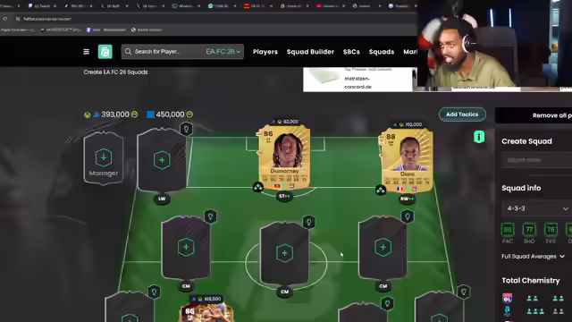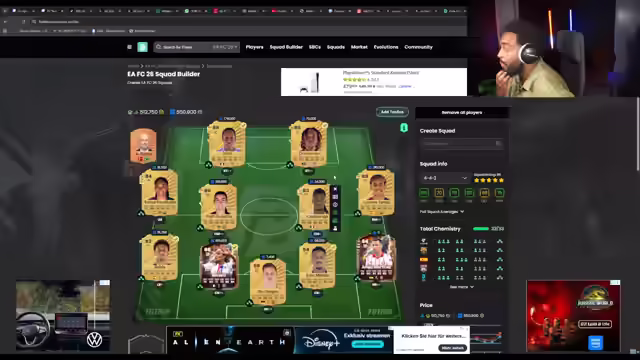 07:59:48Ein Zuschauer namens Hamed wird gegrüßt, und es wird über zukünftige Streaming-Pläne gesprochen. Der Streamer erkundigt sich nach dem Wohlergehen von Hameds Familie. Es wird besprochen, wie eine rote Karte im Spiel entfernt werden kann. Es wird geschätzt, dass durch den Verkauf von Spielern etwa 700.000 bis 800.000 Coins erzielt werden können. Die aktuellen Spieler werden bewertet, wobei Tonali als potenziell nützlich angesehen wird. Eine Doppelsturm-Formation wird in Betracht gezogen, und die Chemie im Team soll durch den Kauf von Rena verbessert werden. Militao wird als starker Verteidiger identifiziert und ins Team aufgenommen. Bremer wird erwähnt, und es wird empfohlen, Spieler auf Plattformen wie Footbin oder FootGG zu überprüfen, um sie optimal zu verkaufen. Lorette soll verkauft werden, während Balde als guter Linksverteidiger in Betracht gezogen wird.