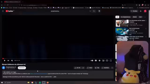 02:40:17Es wird überlegt, welches YouTube-Video als nächstes im Stream reagiert werden soll. Die Wahl fällt zunächst auf ein Video von Simplicissimus über Südkorea, nachdem ein bereits gesehenes Kurzgesagt-Video verworfen wurde. Die Streamerin kündigt an, sich während des Videos Essen zu holen und bedankt sich bei einem Zuschauer für ein Abonnement. Es wird ein weiteres vorgeschlagenes Video über TikTok-Trends in Betracht gezogen, bevor die Entscheidung endgültig auf das Südkorea-Video fällt. Die Streamerin verabschiedet sich kurz, um Essen zu holen, und bereitet das Video für die Zuschauer vor.
