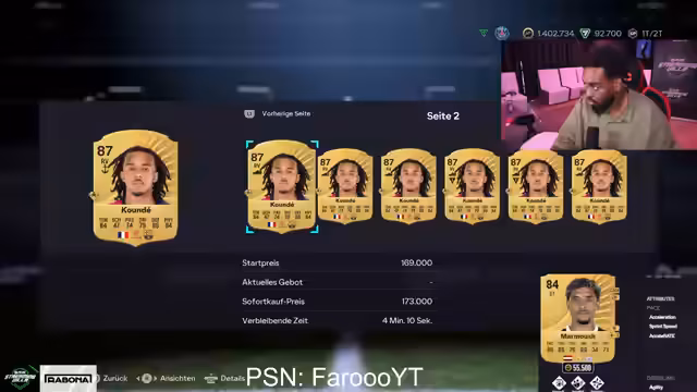 17:41:02Während der Pack-Öffnungen wird Francesco Totti gezogen, was den Streamer begeistert. Auch Chiellini und Toni Kroos werden gezogen, wobei die Gesamtkraft der Karten gelobt wird. Parallel dazu wird aktiv auf dem Transfermarkt gehandelt. Der Streamer kauft Spieler wie Nuno Mendes, Fandewein und Hakimi, bemängelt aber die hohen Preise und die Schwierigkeiten, Spieler zu snipen. Die Kurse vieler Spieler steigen stark an.