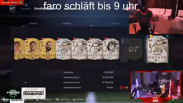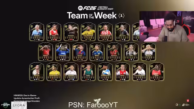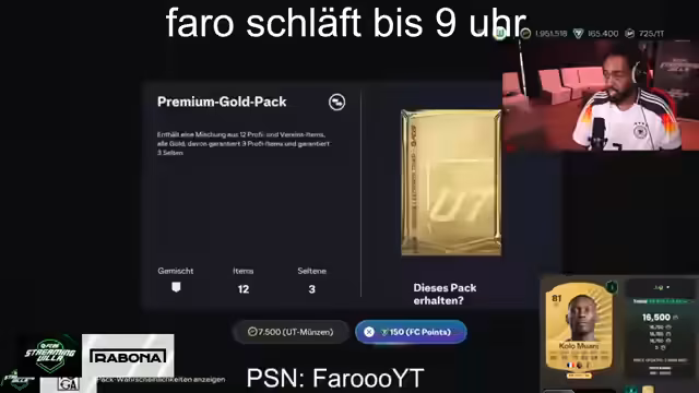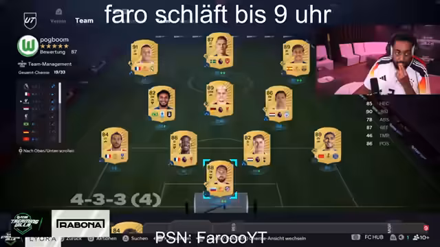 15:10:38Um die Zeit zu überbrücken, wird eine FIFA-Bingo-Challenge inszeniert. Dabei werden bestimmte Kriterien wie das Ziehen von Spielern mit einer bestimmten Gesamtwertung oder mit Glatze definiert. Währenddessen gibt es Diskussionen über Pack Openings, wobei Faro mitteilt, dass er fast ausschließlich Spieler mit weiblichem Geschlecht zieht und sich darüber amüsiert. Weitere Pack Openings folgen, mit Fokus auf Spieler wie Claudio Pina und Salma Paduelo.