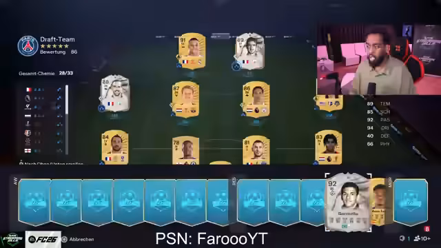 08:27:35Neben den Pack-Öffnungen wird das Gameplay intensiv analysiert und diskutiert. Der Streamer coacht seine Mitspieler in Draft-Spielen, konzentriert sich dabei jedoch stark auf den Ballbesitz und das Spielaufbauverhalten. Er kritisiert Fluchtfehler und unvorsichtige Drehungen, die zu Ballverlusten führen, und betont die Wichtigkeit eines ruhigen, kontrollierten Spiels. In einem Draft-Spiel mit einer 'R9'-Karte wird der Spielstil rund um diesen Top-Spieler analysiert, wobei der Streamer vor zu viel Ehrgeiz warnt und stattdessen auf einfache, effektive Aktionen drängt. Die Kommentare zeigen ein tiefes Verständnis für die Mechaniken von FC 26, wobei der Fokus auf der Vermeidung von Fehlern und der Nutzung von Stärken der Spieler liegt.