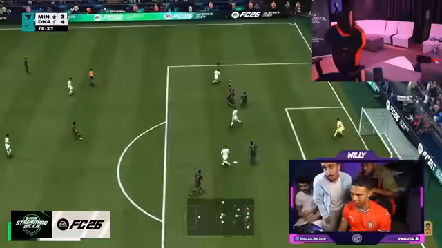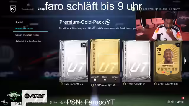 18:51:56Zwischen den Pack-Öffnungen wird ein FC 26-Spiel gestreamt, bei dem der Streamer ein Team aus Paris-Saint-Germain- und FC-Barcelona-Spielern gegen einen Gegner in einem Marathon-Spiel mit anschließendem Elfmeterschießen bestreitet. Das Spiel dauert über 100 Minuten und endet unentschieden. Gleichzeitig wird das Alltagsleben in der Villa thematisiert, wie z.B. die Kälte im Raum, ein Gespräch über eine Webseite, die den Streamer darstellt, und Pläne für eine Challenge mit Wachsstreifen als Bestrafung für den Verlierer.
