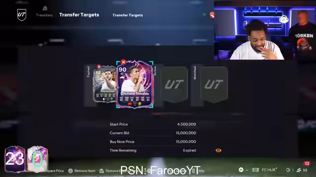 01:12:02Der Streamer diskutiert über den Wunsch, Cristiano Ronaldo zu ziehen, und bedauert den hohen Preis von 15 Millionen Münzen. Er führt den exorbitanten Preis hauptsächlich auf den Namen des Spielers zurück und stellt die Frage, wie teuer die Karte ohne diesen Namen wäre. Eine Wette wird gestartet, bei der der Streamer mit 8 Packen versucht, entweder Ronaldo, Thomas Müller oder eine Time Warp Icon zu ziehen. Eine wiederkehrende Kritik richtet sich gegen Playstyles, die den Wert von Spielern wie Ronaldo negativ beeinflussen könnten.