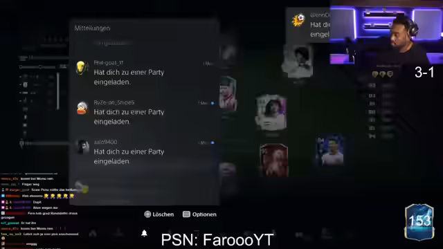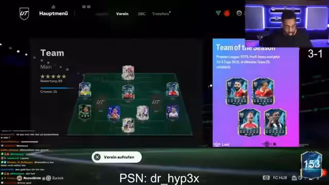 01:05:31Ein neuer 'Eike-Pick' SBC (Squad Building Challenge) wird angekündigt. Bei der ersten Öffnung des Challenges entsteht aufgrund eines Fehlers die Möglichkeit, sehr gute Karten für wenig Coins zu erhalten. Der Streamer ermutigt die Chat-User, diesen Fehler zu nutzen und die Challenge schnell zu absolvieren. Während der Versuche, den neuen SBC und andere Packs zu öffnen, stürzt die PlayStation Network mehrfach ab, was den Stream unterbricht und zu einem Wechsel des Kontos zwingt.