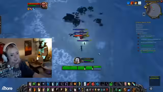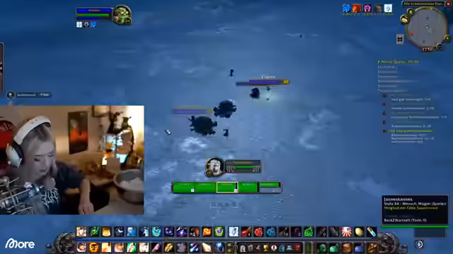 12:55:55Die Streamer konzentrieren sich auf Unterwasser-Quests und die Notwendigkeit eines Atembuffs. Als Hexer kann der Streamer diesen Buff zur Verfügung stellen, was das Questen im Wasser erheblich erleichtert. Sie müssen jedoch aufpassen, dass der Buff nicht abläuft, da sonst das Ertricken droht. Die Gruppe sammelt verschiedene Gegenstände, und es gibt Diskussionen über das Loot-Verhalten und die Tatsache, dass manche Gegner keinen oder nur geringen Loot droppten.