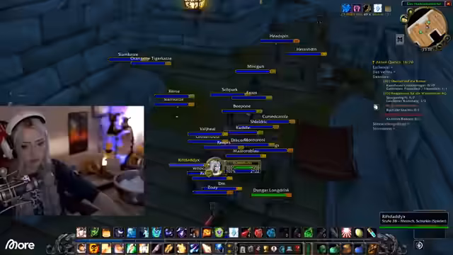 03:13:47Nachdem die Quests in den Schimmernden Ebenen abgeschlossen sind, wendet sich die Gruppe dem Dungeon Gnomeregan zu. Der Streamer ist unsicher über den Erfolg, da die Gruppe wenig Erfahrung mit dem Dungeon hat. Gleichzeitig macht er sich Sorgen über das Rennauto im Sauerkraut-Event, bei dem er schon einige Teile hat, aber der Fortschritt stockt. Der Fokus verlagert sich vom Questen auf den bevorstehenden Instanzrun, der die Gruppe vor eine neue Herausforderung stellt.