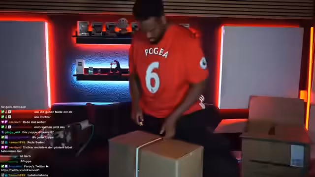 00:03:20Der Stream beginnt mit persönlichen Themen und Ankündigungen. Der Streamer feiert seinen Geburtstag und erwähnt, dass er am darauffolgenden Tag einen „seriösen Stream“ mit Anzug und Krawatten geplant hat. Die Aufmerksamkeit gilt zunächst großen Geschenkpaketen, die er von Kollegen erhalten hat. Nach anfänglicher Zögerlichkeit öffnet er eines der Pakete live und stellt einen schweren Bürostuhl fest, der selbst zusammengesetzt werden muss. Ein zweites Paket enthält eine zeichnerische Widmung von einem Kollegen, die er aufhängen möchte. Parallel wird die Technik im Stream optimiert, um FIFA zu spielen.