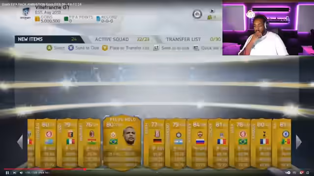 00:31:46Der Streamer führt eine umfassende Nostalgie-Tour durch die Geschichte der FIFA-Pack-Animationen, von FIFA 09 bis hin zu FC 25. Besonders gelobt werden die kreativen Animationen von FIFA 17 mit den Stadionflaggen und die Tür-Animationen von FIFA 20 und 21. FC 22 und FC 23 werden als katastrophal und von "Praktikanten" gemacht bezeichnet.