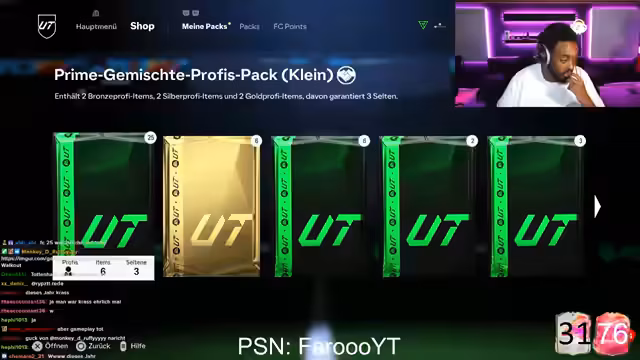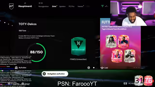 00:48:25Aufgrund einer früheren Account-Sperre aufgrund von betrügerischen Aktivitäten eines Moderators hat der Streamer große Vertrauensprobleme bei der Übergabe seines Accounts. Er plant dennoch, eine große Wette zu veranstalten, bei der er versucht, aus 20 Packs zwei Karten mit 98+ Rating oder eine 99er Karte zu ziehen. Für die Teilnahme müssen die Follower dem Kanal folgen.