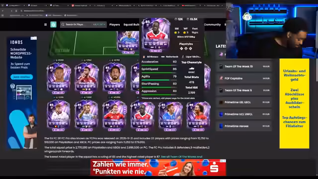 01:10:26Es gab Verwirrung und eine Rückfrage bezüglich der Erlaubnis für gemeinsame Streams. Währenddessen fielen auf dem Markt die Preise vieler Spieler, insbesondere vorbestellter Icons. So stieg der Mbappé-Gold-Preis leicht, während Spieler wie Bonmatti, Rivière und Eto' deutlich an Wert verloren. Pina, der vor Kurzem noch 1,7 Millionen kostete, fiel auf eine Million, was zu Überlegungen führte, ihn zu verkaufen. Einige Spieler wie Nunes und Garnacho, deren Karten potenzielle Upgrades erhalten, wurden ebenfalls diskutiert.