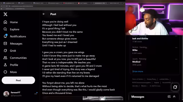01:14:32Während des Streams wird über Body Face gesprochen, der gerade einen Vertrag bei Werder Bremen unterschreiben soll. Überraschend ist, dass er währenddessen Warzone auf Twitch streamt, was der Streamer als krank empfindet. Der Streamer bewundert Fußballer, die von Jugend an hart trainieren müssen und dabei viele Opfer bringen. Er ärgert sich über die Tatsache, dass Body Face gleichzeitig einen Vertrag unterschreibt und spielt, was er als "OP" (overpowered) beschreibt - als einfaches Leben im Vergleich zum harten Weg professioneller Fußballer.