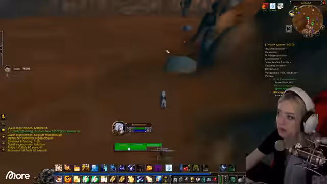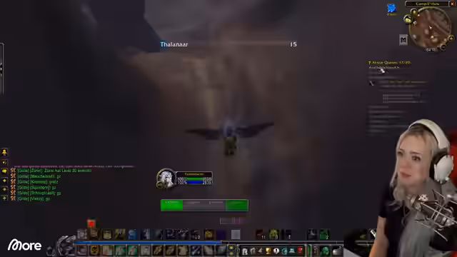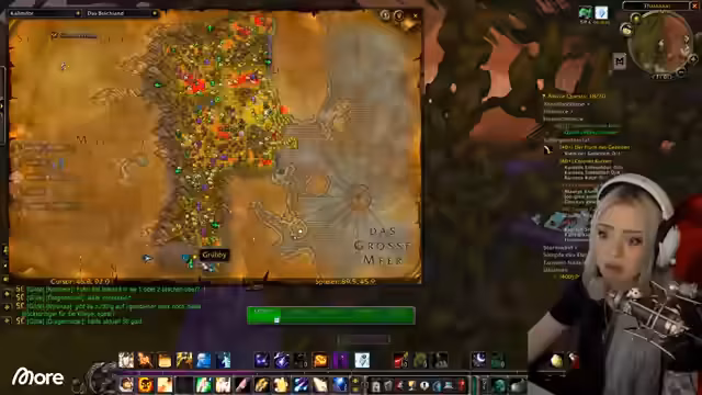 00:18:07Der Fokus des Streams liegt auf dem Gameplay in World of Warcraft. Der Streamer befindet sich auf Level 40 und beschäftigt sich mit der Suche nach Quests, dem Sammeln von Erfahrungspunkten und der Farmen von Ressourcen wie Kräutern. Lange Flugzeiten und die Suche nach einem geeigneten Gebiet für die Quests sind ständige Themen und erfordern strategische Planungen.