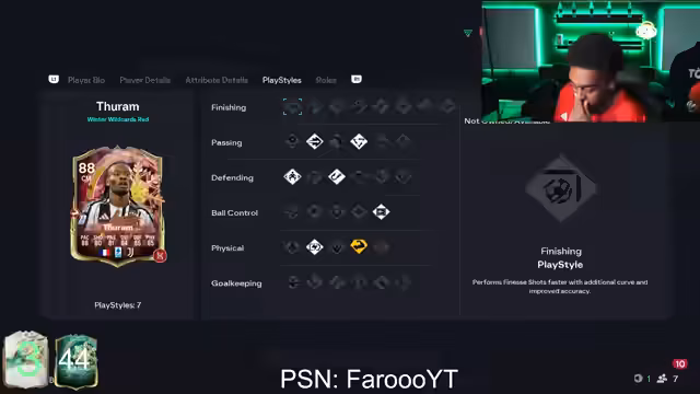 00:44:52Im späteren Verlauf des Streams werden die spektakulärsten Belohnungen des Season Pass vorgestellt. Die absolute Highlight-Karte ist Claudia Pina im Team of the Year-Look, die durch einen Level 36-Evo sowohl den Spielertyp Technical als auch Finesse in Gold erhalten kann. Der Streamer wiederholt mehrfach, dass es sich hierbei um eine der besten Karten des Spiels handelt. Anschließend wechselt der Fokus zu Gameplay, bei dem versucht wird, die Aufgaben des Golden Goal Cups zu erfüllen, insbesondere 20 Tore per Powershot in Squad Battles. Dies gestaltet sich als äußerst schwierig und frustrierend für den Streamer.