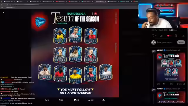 01:42:16Der Streamer äußert massive Enttäuschung über die bisherigen Team of the Season (TOTS) Karten der Premier League und League A. Er bewertet die meisten Karten als nicht spielbar und kritisiert die geringe Anzahl an wirklich hochwertigen Spielern. Dementsprechend hoch ist seine Vorfreude auf das kommende Bundesliga TOTS, für welches er ein deutlich besseres Team prognostiziert. Spieler wie Schechko, Smith, Ikitike und Ulysse sollen dabei eine besondere Rolle spielen.