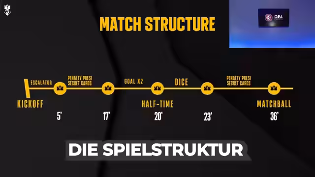 00:06:47Der Streamer geht auf die Besonderheiten der Kings League ein und erwähnt das bevorstehende Spiel der Präsidenten am 22.11. sowie ein Creator-Turnier. Es werden die Secret Cards als spielentscheidendes Element erläutert, wie Penalty, Shootout, Suspension oder Joker. Die Besonderheit des President Penalty wird kurz angesprochen, bevor die reguläre Partie beginnt, bei der Vice Versa gegen das favorisierte No Rules FC antritt.