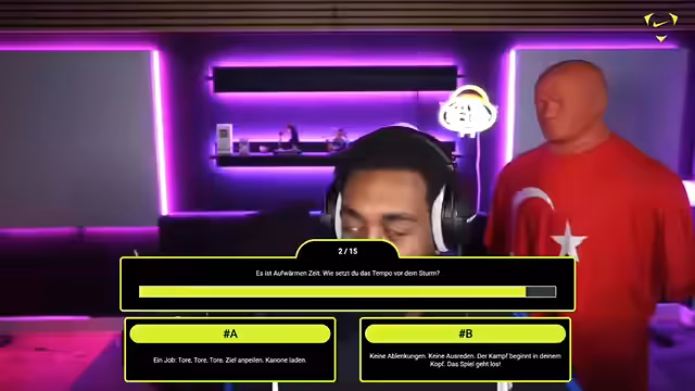 01:27:45Nach der Präsentation aller fünf Albtraum-Clips startet ein interaktives Quiz. Der Streamer stellt sieben multiple-choice-Fragen, die sich auf die gezeigten Videos und das Thema der Nike-Kampagne beziehen. Die Zuschauer müssen ihre Antworten per Hashtag (A oder B) im Chat posten. Die Fragen sind bewusst provokant und phantasievoll formuliert und behandeln Themen wie die Energie vor dem Spiel, persönliche Rituale und die Psychologie des Wettbewerbs. Der Streamer kommentiert die Ergebnisse live und zeigt sich über das Engagement der Chat-Community begeistert.
