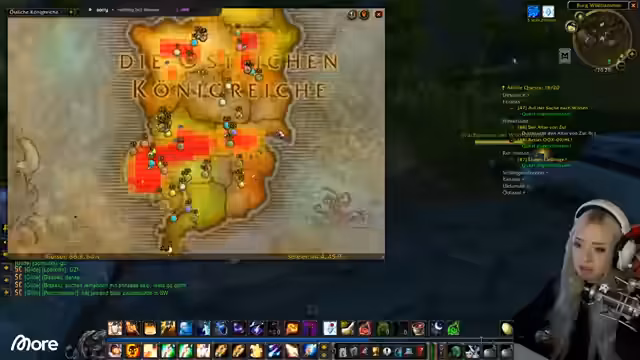 02:23:40Die Aktivitäten konzentrierten sich auf das Gebiet Tanaris in World of Warcraft. Der Fokus lag auf dem Abschließen von Quests wie der Geisterplasma-Quest, was durch das Spawnverhalten der Mobs erschwert wurde. Der Streamer erwähnte das Farmen von Mobs für Erfahrungspunkte (EP), wobei er etwa 400 EP pro Mob erzielte, und nutzte die Zeit auch, um nebenbei Kettenringe für ein Armband zu basteln.