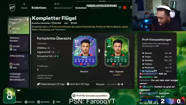 02:54:37Es werden neue Player Picks (2 x 88+) und Grassroot Shoppicks erwähnt, wobei die Zuschauer angeregt werden, die Arbeiter des Vertrauens nach Points zu fragen. Es wird festgestellt, dass Parkkarten absichtlich nicht in die Auswahl passen, um zu verhindern, dass zu starke Kombinationen entstehen. Ribarie wird als nicht ideal für die neue Evo angesehen, da er keine 2 Pacer Plus bekommt. Es werden verschiedene Spieler diskutiert, die gut in die Evo passen könnten, darunter Gabi und Sabine. Der Streamer wartet auf die 8+ Picks und öffnet zwei garantierte tradable Grassroot Shoppicks. Pulisic in Form und Hakan werden gezogen, wobei der Streamer Beif behält, da er eventuell in eine zukünftige Ebroi passen könnte. Im zweiten Pick werden Delhi und Hakan gezogen, was den Streamer bestätigt, dass er es wusste. Es wird spekuliert, warum Neymar im Preis gestiegen ist.