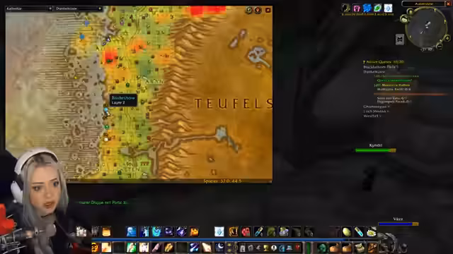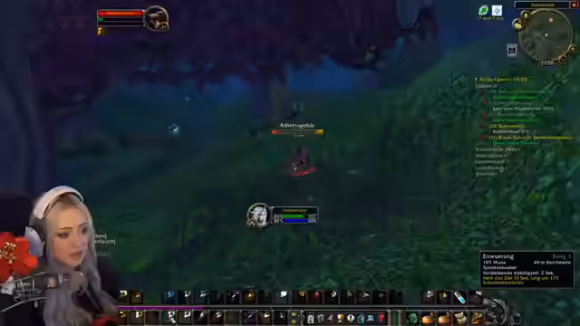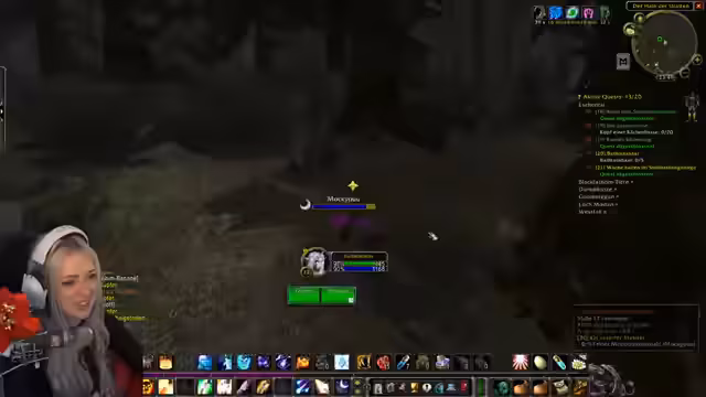 01:39:23Das Farmen von Kräutern im Eschental wird zum wiederholten Schwerpunkt. Die Streamerin fliegt durch das Gebiet und sucht nach Königskraut, wird aber durch feindliche Mobs und die ständige Angst vor dem Tod gebremst. Sie überlegt, einen neuen Heiltrank herzustellen, um sicherer zu werden, und diskutiert strategisch, ob es sinnvoller ist, sich in Auberdine oder Astranaar zu binden, um den Transport von Farm-Gütern nach Sturmwind zu optimieren. Der Fokus liegt auf der Risikominimierung bei der Ressourcenbeschaffung.