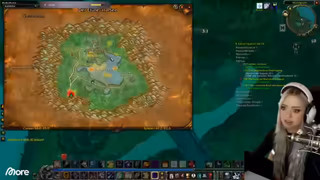 05:49:27Nach der Entscheidung für den Level-60-Tag morgen wird der Stream in ein neues Gebiet verlagert, um die letzten fehlenden Erfahrungspunkte zu sammeln. Die Navigation gestaltet sich dabei schwierig, da die Wege nicht klar sind und Hordengebiete umgangen werden müssen. Dennoch wird der Ort mit Hilfe des Chats gefunden und die letzten XP durch das Töten von Gegnern und das Ausführen von kleinen Quests eingeholt.