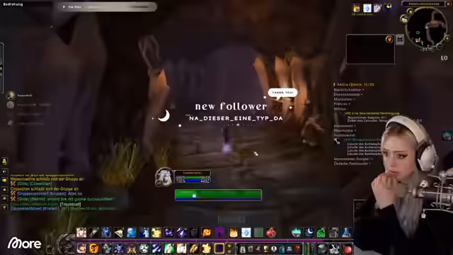 04:51:34Im Chat werden gemeinsame Aktivitäten besprochen. Es gibt Empfehlungen für eine Höhlenquest, die als Folgequest einer anderen Mission gesehen wird. Der Streamer bietet an, sich bei anderen Spielern zu verbünden und mit deren Gruppen zu kooperieren. Gleichzeitig wird eine Escort-Quest erwähnt, bei der eine Gefangene aus einem Haus befreit werden muss. Der Streamer hakt mit den Chat-Mitgliedern ab, ob diese an der gemeinsamen Aktion teilnehmen wollen.