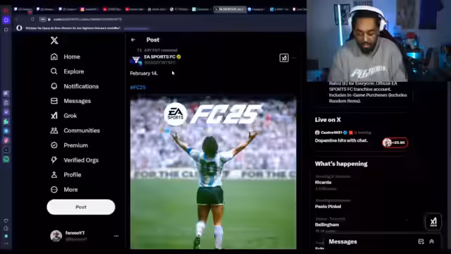 00:01:28Nach einer kurzen Begrüßung geht der Streamer direkt zur Ankündigung einer großen Neuheit: Diego Maradona kehrt offiziell in FIFA zurück. Dies bestätigt EA Sports höchstpersönlich via Insta-Story, was beim Streamer für Gänsehaut sorgt. Er informiert den Chat, dass Maradona am 14. Februar erscheinen wird und begeistert bereits über die kommende Veröffentlichung. Der Streamer zeigt sich sehr begeistert von der Rücklegende und möchte diesen Moment teilen. Es geht jedoch auch um technische Aspekte, wie eine leicht zu laute Mikrofoneinstellung.