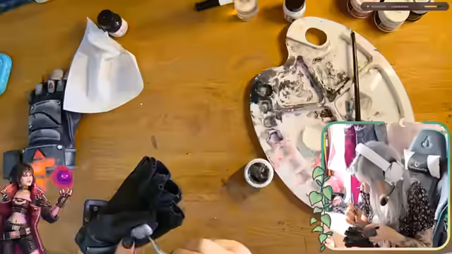 01:04:08Es wird kurz erwähnt, dass Figuren von Warhammer zum Bemalen empfohlen werden, aber aufgrund anderer Hobbys wie Kostüme und Bilder dies nicht ins Repertoire passt. Es wird aber jedem viel Spaß dabei gewünscht, der Figuren bemalt und es wird erwähnt, dass ähnliche Farben wie von Vallejo oder Liquid Text verwendet werden könnten. Die Streamerin verwendet Lederfarbe für die Schuhe, da sie herausgefunden hat, dass diese gut hält und sie noch welche zu Hause hatte. Es wird kurz auf Citadel-Farben und den 'Held der Steine' Bezug genommen. Der Streamerin fällt ein Ladekreis auf, der von der Balkon-Cam übrig geblieben ist und vergessen wurde auszublenden. Ein abgefranster Lieblingspinsel wird für Ausbesserungen verwendet und ein kleiner Fehler wird genutzt, um andere Stellen auszubessern. Es wird überlegt, was ein 'Wash' ist und erwähnt, dass von außen noch etwas drum kommt. Fahrradhandschuhe mit Magneten werden gezeigt, die das An- und Ausziehen erleichtern, da die vorher selbstgenähten Handschuhe kaputt gegangen sind. Ein Acrylmarker wird verwendet, um Schwarz zu verblenden, wobei ein Hauch von Wasser zur Hilfe genommen wird.