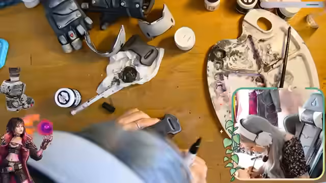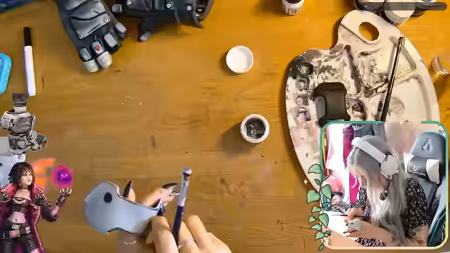 01:59:13Nach der Messe hatte ich trotz des Adrenalins mit der Müdigkeit zu kämpfen, besonders morgens. Matcha ist eine gute Alternative für einen sanfteren Energiekick ohne starken Crash. Die Community teilte ihre Erfahrungen mit Matcha. Nach einer kurzen Toilettenpause während der Werbung, widmete ich mich wieder der Arbeit und begrüßte die Zuschauer. Cessmaus ist auf dem Weg, aber wir müssen bald zur Uni aufbrechen. Ich arbeite an hellen Akzenten und Borderlands-artigen Effekten, indem ich mit einem Pinsel über die Farbe gehe, um sie abzuschwächen, anstatt direkt weiße Farbe zu verwenden. Ich bedanke mich bei Kowal für den Resub. In etwa einer Stunde muss ich los zur Uni, vorher möchte ich noch kurz etwas grundieren.