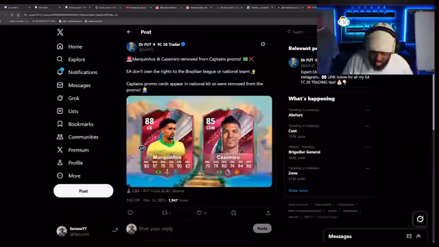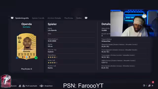 01:42:26Der Streamer öffnet verschiedene Packs und zeigt neue Pulls, darunter einen sehr starken 85er Openda. Er kritisiert die geringe Wahrscheinlichkeit bei Special Player Choice Packs (SPCs) und die Upgrade-Bedingungen. Er hat große Mühe, ein funktionierendes Team mit hochwertigen Spielern für das kommende Event zusammenzustellen, was ihn zu drastischen Entscheidungen wie dem Verkaufen von Spielern zwingt.