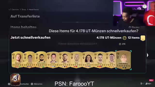 03:21:19Der Streamer öffnet verschiedene Packs im Spiel, darunter seltene Profi-Packs und 50k-Packs, mit dem Ziel, wertvolle Spieler zu ziehen. Er äußert die Bedingung, dass er eine Icon discarden muss, falls er eine zieht. Es wird festgestellt, dass die Packweight reduziert wurde, was es erschwert, gute Spieler zu ziehen. Trotz mehrerer Walkouts werden keine Cornerstone-Spieler gezogen, was zu Enttäuschung führt. Es wird spekuliert, dass Claudia Pina kein POTM (Player of the Month) erhält, was den Wert der Cornerstone-Karte steigern könnte. Der Streamer bedankt sich für neue Follower und erwähnt Anjo Bild, der 500 Bits gespendet hat. Er zieht einen Cornerstone, Aklitschuk, ist aber enttäuscht, dass er nicht einmal einen Walkout erzielt. Der Streamer äußert Frustration über die schlechten Ergebnisse der Packs und die hohen Preise der Spieler auf dem Markt.