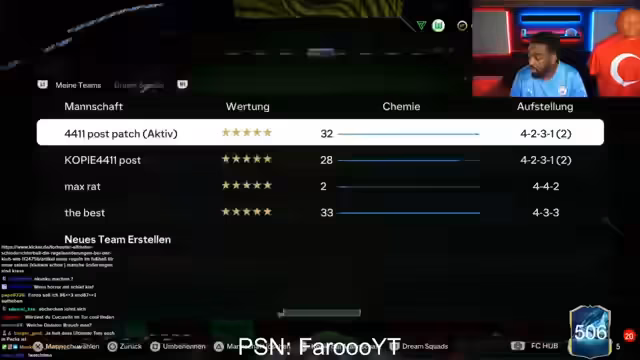 01:32:39Der Streamer bereitet sich auf einen FIFA-Cup vor und bespricht mögliche Spieler für sein Team. Er testet verschiedene Formationen und Spielerkombinationen, darunter Quadrado, Rollit und Van der Sar. Er äußert sich zur Golden-Goal-Regel im Modus und gibt zu, in diesem Format nicht besonders stark zu sein. Gleichzeitig werden technische Aspekte des Streams angesprochen, wie Mikrofoneinstellungen und Soundprobleme.