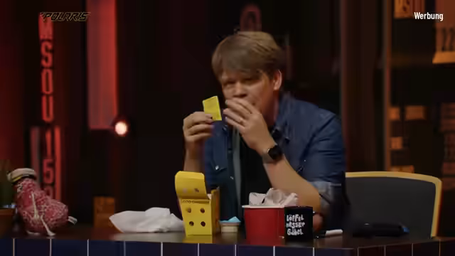 05:24:59Drittes Produkt ist eine Kombination aus frittierten Hühnerfilets und Kartoffelbällchen, serviert mit Trüffel-Mayonnaise. Colin Gäbel findet die Filets 'angenehm abgewürzt', kritisiert aber die Kälte des Essens. Bei der Trüffel-Mayo zeigt er sich besorgt vor einer Überdosierung. Der Cheese-Garlic-Flavor wird als 'räudiger Käsegeschmack' beschrieben. Die Verkostung endet mit der Vergabe von zwei Noten: eine 8 vom Publikum und eine 5 von Colin.
