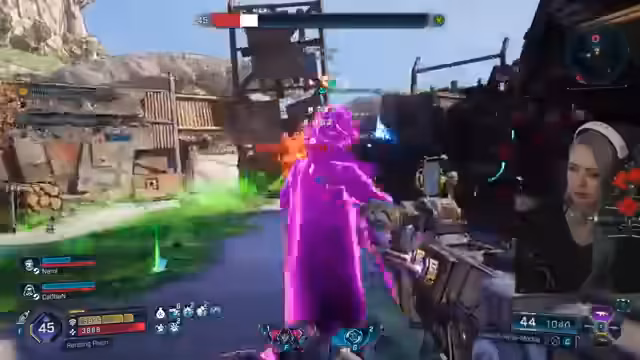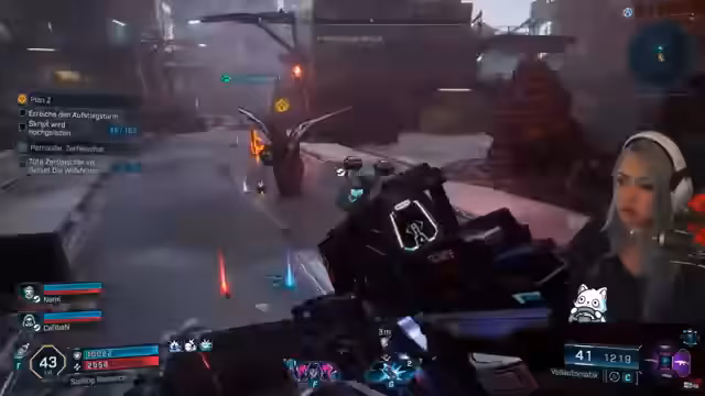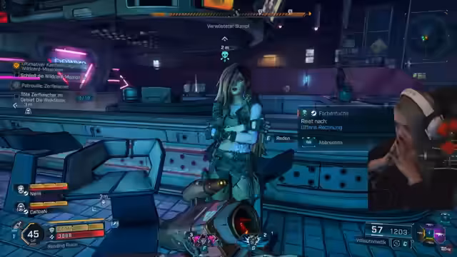 00:54:09Der Stream spielt das Spiel Borderlands. Dabei wird über die anfänglichen Schwierigkeiten des Spiels nach einem großen Update gesprochen. Die Map wird als unübersichtlich kritisiert und das Navi als ungenau. Während des Spiels wird eine Lieblingswaffe vorgestellt, eine Wegwerfwaffe mit alternativem Feuermodus, die als Support-Drohne fungiert und Heilungsfähigkeiten besitzt, was für große Begeisterung sorgt.