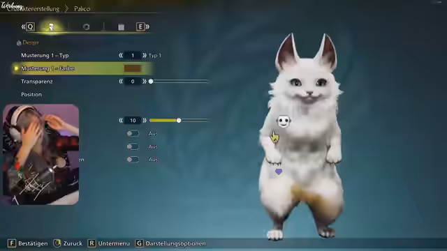03:28:38Nach der Charaktererstellung wendet sich die Streamerin der Gestaltung ihres Palikurs zu, wobei sie sich erneut für den "Plüschi" entscheidet. Sie experimentiert mit verschiedenen Fellmustern, Farben und Ohrenformen, um das Aussehen des Palikurs anzupassen. Dabei werden auch ungewöhnliche Optionen wie eine andere Augenfarbe und Muster ausprobiert. Es wird überlegt, ob der Palikur ein besonderes Merkmal wie eine Goldtatze oder einen Farbtupfer erhalten soll. Die Streamerin lässt sich von den Vorschlägen der Zuschauer inspirieren, ist aber oft unentschlossen und ändert ihre Meinung mehrfach. Am Ende entscheidet sie sich für ein eher unauffälliges Design mit einem kleinen Farbtupfer, der wie eine goldene Pinselspitze aussieht. Sie scherzt darüber, dass dies dem Palikur Glück bringen soll. Zum Schluss wird dem Palikur der Name Captain Plüschpo gegeben.