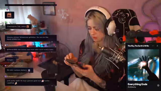 00:52:22Bereitet sich darauf vor, auf das neue Album von Architects zu reagieren. Sie erwähnt, dass der erste Song Elegy neu ist und dass sie einige der anderen Songs bereits kennt. Sie fragt den Chat, ob sie die Musik lauter machen soll und bedankt sich bei Thorsten für die Spende. Sie vergleicht Black Hole mit Helene Fischer und freut sich auf Braindead. Sie fügt Lampen hinzu, um die Stimmung zu verbessern. Sie erwähnt, dass sie im Juni nicht in Deutschland ist und dass der Sänger von Falling in Reverse manchmal komische Takes hat. Sie erwähnt, dass sie mehr in Arch Enemy reinhören muss und dass einige Leute im Chat viel Wissen und Meinungen dazu haben.