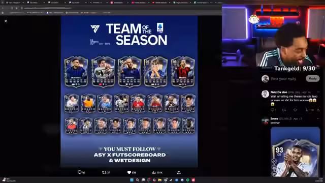 03:09:21Der Streamer wendet sich der kommenden Premier League TOTS zu und äußert seine Erwartungen. Er ist der Meinung, dass die Karten in der Premier League besser sein müssen, da die Serie A in der vorherigen Woche enttäuschend war. Er listet potenzielle TOTS-Spieler auf und argumentiert, dass EA aufgrund der vielen hochbewerteten Spieler keine Wahl habe als krasse Karten zu veröffentlichen. Er betont, dass Spieler wie Saliba, Gabriel und Bruno Fernandes garantiert gute Karten bekommen werden.