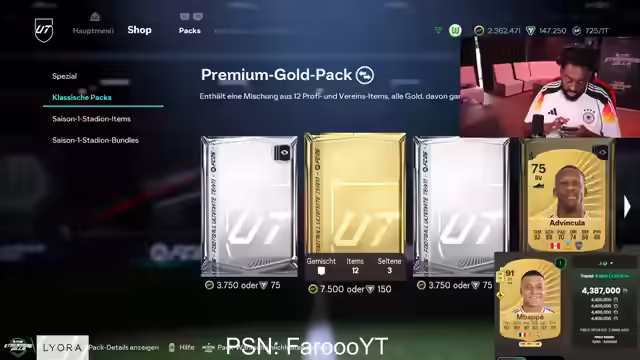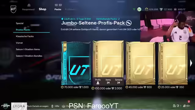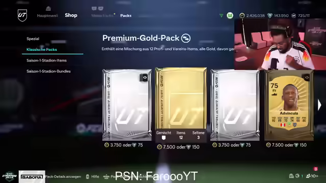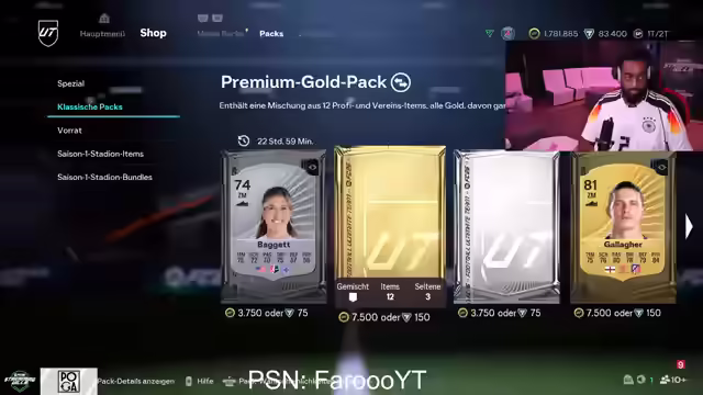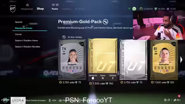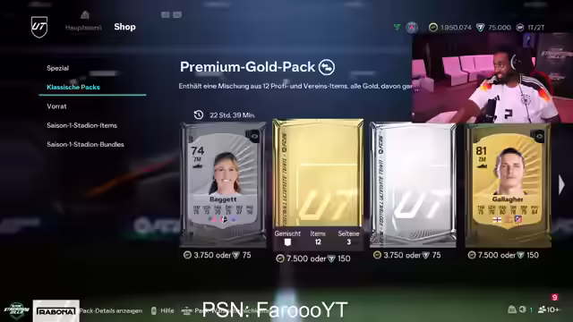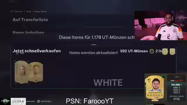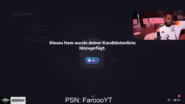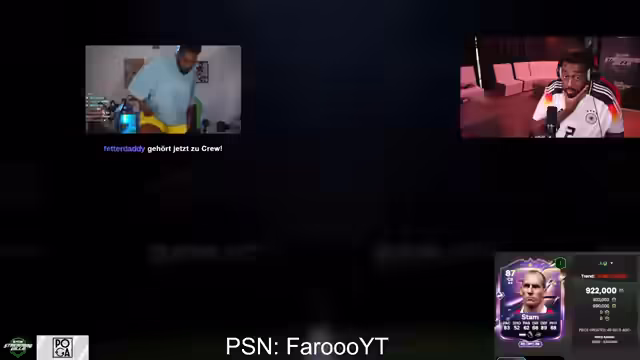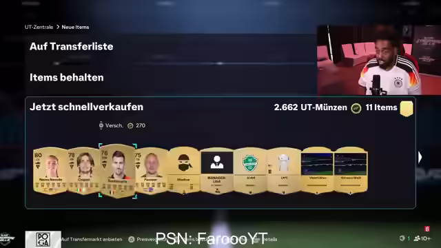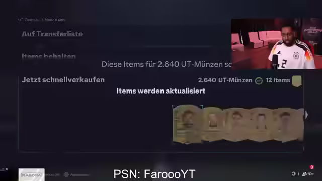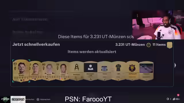 11:21:54Es wird angekündigt, dass am nächsten Tag weitere Pack Openings stattfinden werden. Der Streamer äußert den Wunsch, teure Spieler wie Hakimi zu ziehen. Es wird über das Ändern von Wappen im Spiel diskutiert, wobei der Streamer verschiedene Optionen wie Paris Saint-Germain und Besiktas in Betracht zieht. Es wird über das Ziehen von Trikots und den Wert von Spielern gesprochen. Der Streamer äußert Frustration darüber, seit Stunden keine wertvollen Spieler mehr gezogen zu haben und droht, Hamid aus dem Raum zu werfen. Es wird über den Wert von Spielern diskutiert und der Streamer ruft Pierre, um jemanden rauszuschmeißen. Es wird überlegt, ob man schlafen gehen soll und der Streamer äußert den Wunsch, dass Faru einen teuren Spieler zieht, den er dann abstoßen muss.