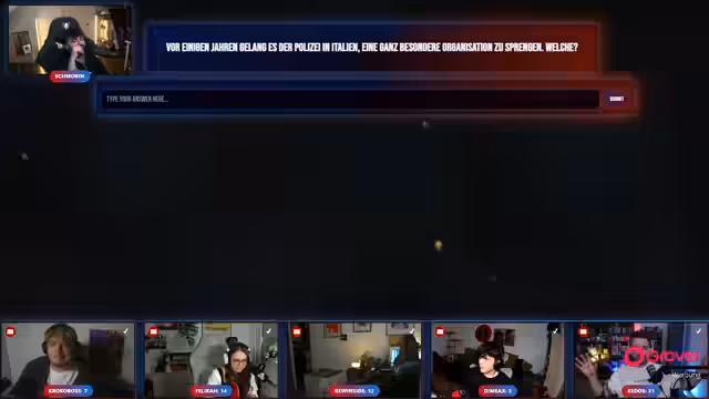 04:00:32Nach intensiver Debatte über die von der Polizei in Italien „gesprengte“ Organisation wird die richtige Antwort als „Call-Girl-Ring, dem ausschließlich Großmütter angehörten“ identifiziert. Die Diskussion dreht sich um falsche Spuren wie die „Drangheta“-Mafia und die Regierungspartei „Fratelli d’Italia“. Der Streamer zeigt sich beeindruckt von der Kreativität der falschen Antworten, insbesondere von der Antwort eines Chatteilnehmers.