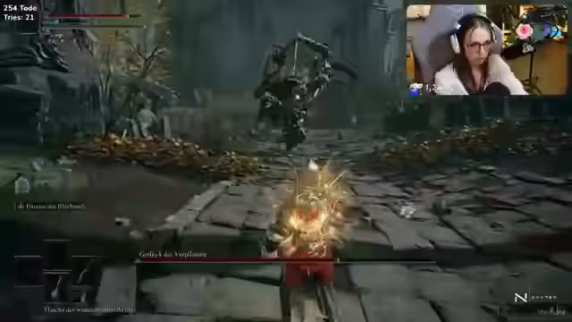 01:34:21Nach langem Zögern und Frust über Pummelparty wechselt der Stream endlich zu Elden Ring, um den Boss Godrick zu bekämpfen. Der Kampf beginnt, gestaltet sich aber als schwierig. Die Streamerin ist mit den Attacken Godricks, insbesondere dem Feuer, überfordert und erhält viel Schaden. Es wird versucht, verschiedene Taktiken anzuwenden, wie das Ausweichen und das Trinken von Heiltränken, doch diese sind oft nicht erfolgreich. Es vergehen mehrere Versuche ohne Erfolg, was die Nerven der Streamerin belastet und sie an frühere, ähnliche frustrierende Erlebnisse mit anderen Bossen erinnert.