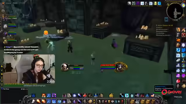 08:56:16Die Gruppe beginnt mit der Erkundung des Schattenlabyrinths. Dabei treten technische Probleme auf, da die Streamerin sich verläuft und per Portal in den Dungeon teleportiert werden muss. Gleichzeitig wird das volle Inventar zu einem Problem, da es den Platz für neue Gegenstände blockiert. Eine kurze Pause wird angedacht, um das Inventar zu leeren und sich auf den nächsten Bosskampf vorzubereiten.