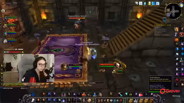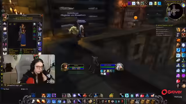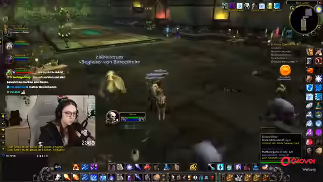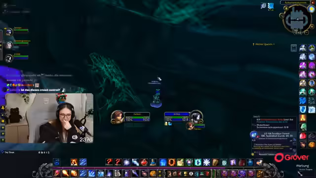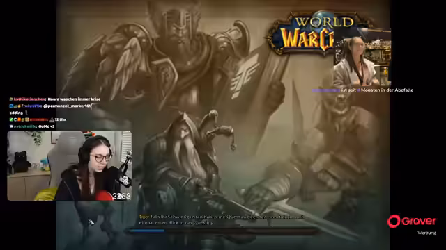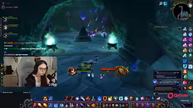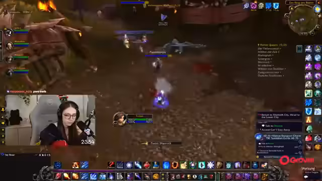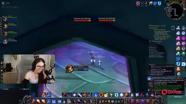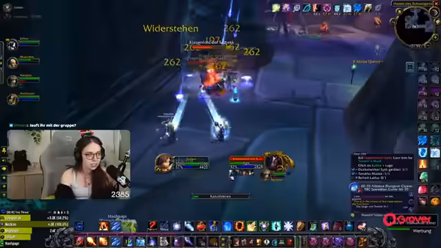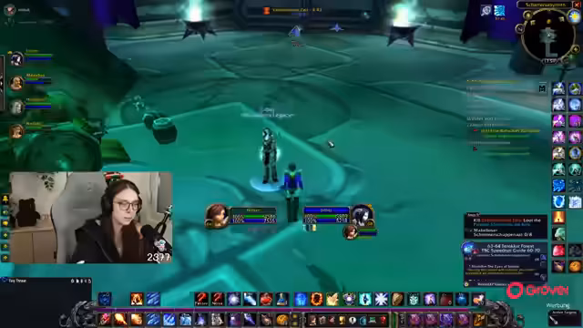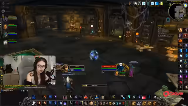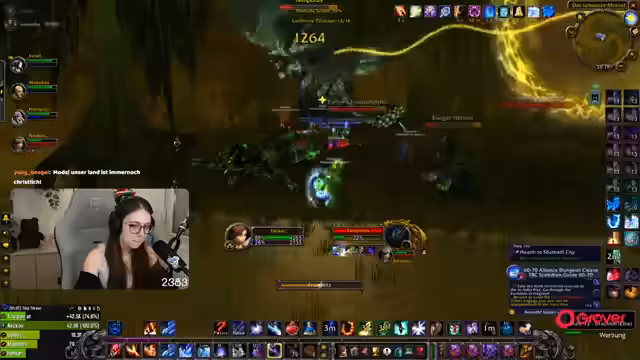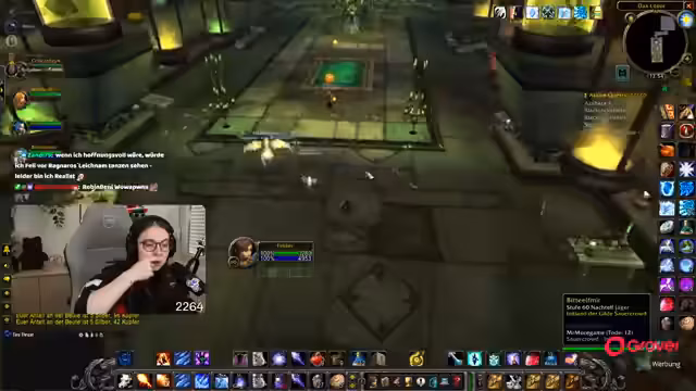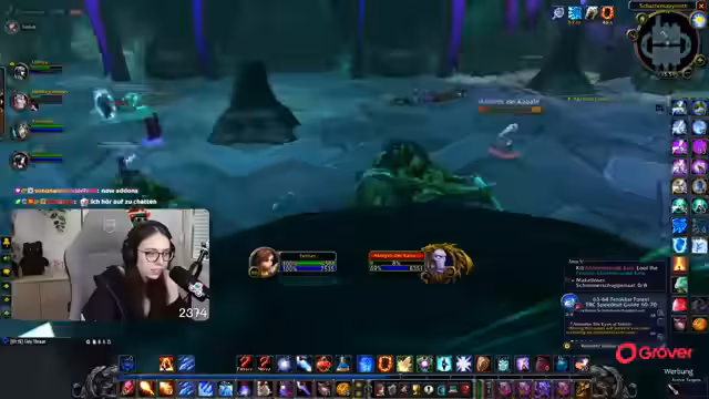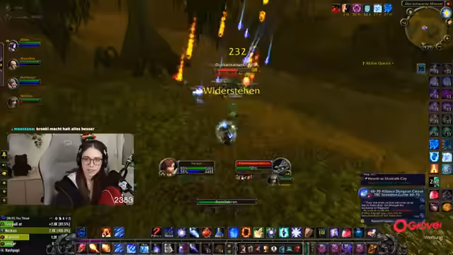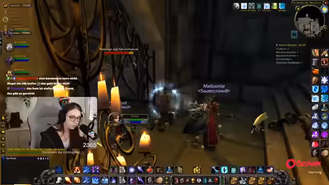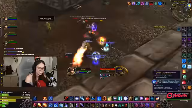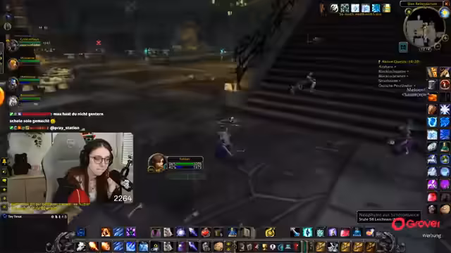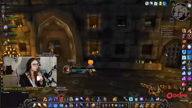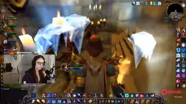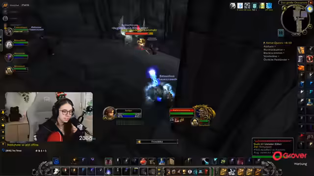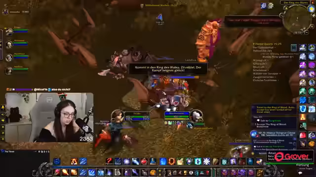 08:49:18Die Gruppe setzt ihre Quests im Ring des Blutes fort, wobei ein Fokus auf der Zusammenarbeit und der Verteilung von Schaden durch AoE-Fähigkeiten liegt. Parallel dazu bedankt sich die Streamerin für einen erhaltenen Raid und kündigt an, dass der nächste Raid direkt angenommen werden kann. Die Koordination mit einem anderen Streamer wird thematisiert, der ebenfalls einen Raid anbietet.