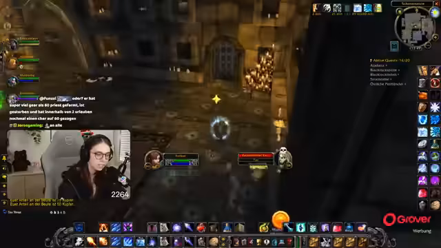 00:14:21Die Gruppe ist nun im Dungeon Scholomanz angekommen und muss sich auf die ersten Gegner vorbereiten. Die Streamerin klärt den Fokus des Runs: Sie möchte vor allem die Stiefel des Blutansturms looten, für die eine spezielle Quest mit Blutritter-Killings erfordert wird. Sie erklärt die Taktik für den ersten Raum mit den Geistern und betont die Wichtigkeit, in bestimmten Ecken zu stehen, um nicht in den Abgrund gekickt zu werden. Es wird auch über den Prioritäten bei den Drops gesprochen, wobei die Hexenklinge ein persönliches Ego-Ziel der Streamerin ist.