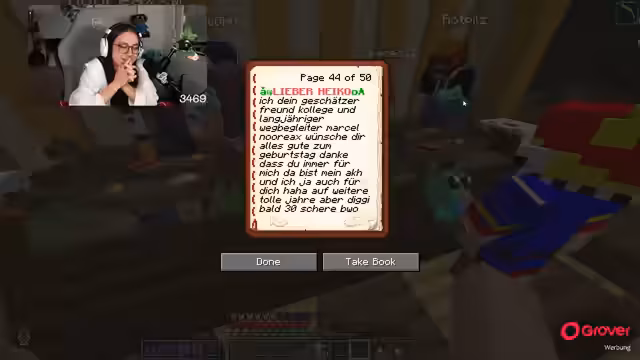 05:07:02Heiko äußert, dass der Moment, in dem er seinen Geburtstag nicht mehr in Minecraft feiert, der traurigste seines Lebens sein wird, woraufhin die Streamerin versichert, dass dies nicht passieren wird. Die Dekoration des Containers wird gelobt, obwohl sie spontan war. Heiko ist begeistert von einem Buch, das von vielen Leuten gefüllt wurde, und die Streamerin erklärt, dass sie diesmal früher mit dem Sammeln der Beiträge begonnen hat. Das Buch enthält persönliche Nachrichten und Scherze, darunter die Angabe, dass Heiko seit dem letzten Geburtstag 940 Millionen Kilometer geflogen ist. Es wird auch ein Code für eine K-Safe-Karte erwähnt, der auf einer Seite des Buches versteckt ist. Die Streamerin und andere Spieler fordern Heiko auf, die Kerzen auf dem Kuchen auszupusten, und es kommt zu spielerischen Schlägereien und Chaos, als die Partygäste beginnen, den Kuchen zu essen.