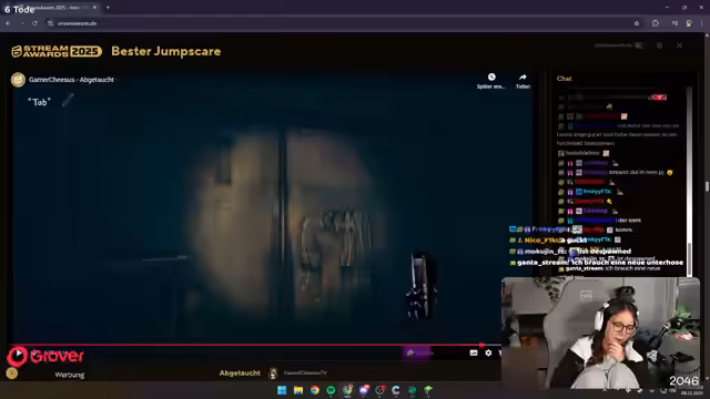 02:55:45In der Kategorie bester Träumoment bewundert der Streamer einen Clip, in dem jemand ein Tattoo anfertigen lässt. Der Clip wird als genial und stark beschrieben. Anschließend folgt die Kategorie bester Jumpscare, die der Streamer hasst, da er schreckhaft ist. Er reagiert auf einen Clip mit NickBit und beschreibt die Situation als gruselig und ihn zutiefst beunruhigend. Des Weiteren wird die Kategorie bestes Streamer-Duo angesprochen, wobei der Streamer bedauert, dass er mit Ketos zu wenig gemeinsame Inhalte im Jahr hatte und daher nicht nominiert wurde.