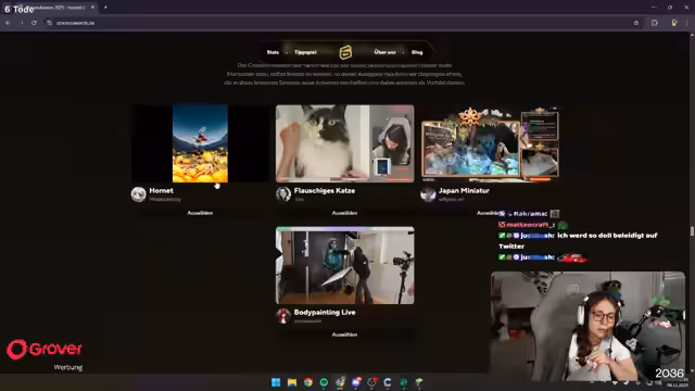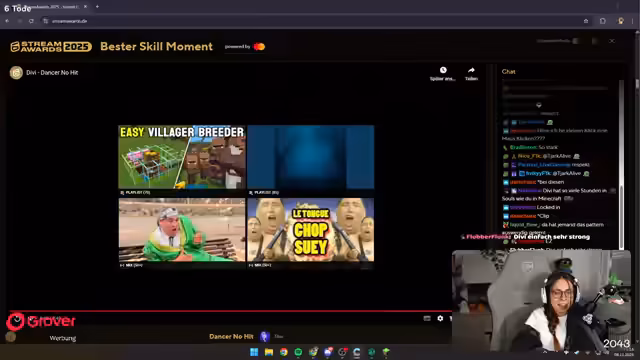 02:43:01Der Streamer ist von einem Clip über perfektes Timing, bei dem ein Fahrrad unfällt und 20 Euro gefunden wird, sehr begeistert und nennt es seinen Favoriten. Eine weitere Kategorie ist die Beste Stimme, bei der er von den außergewöhnlichen Gesangstalente wie Vera, Louis und Aoife beeindruckt ist und Gänsehaut bekommt. Die Entscheidung ist extrem schwierig, da viele talentierte Personen nominiert sind. Der Streamer zeigt große Bewunderung für die Fähigkeiten der Nominierten und bezeichnet die Situation als schmerzhaft, da er sich zwischen so viel Talent entscheiden muss.