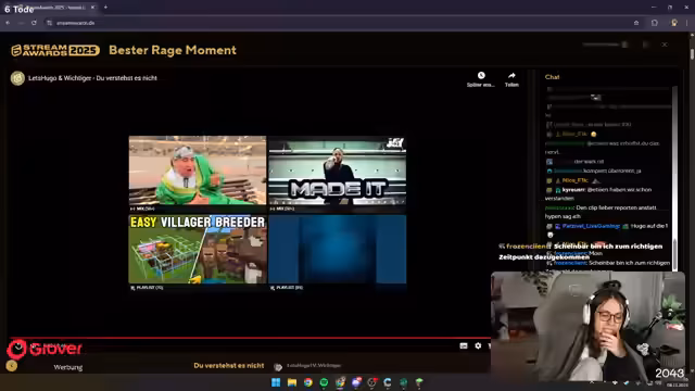 01:37:41Der Streamer startet das Voting für die Stream Awards nach anfänglichen Schwierigkeiten bei der Anmeldung auf der Webseite. Er bewertet verschiedene Clips aus Kategorien wie bester Rage-Moment, bester IRL-Moment und bester Gaming-Moment. Die Themen reichen von wütenden Reaktionen in Videospielen bis zu unangenehmen Situationen im realen Leben und lustigen Missverständnissen während eines Streams. Parallel dazu wird das Thema Charity und Spenden für kranke Kinder behandelt, wobei der Streamer betont, dass jeder Euro zählt und seine Unterstützung für die Aktion erklärt.