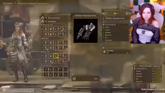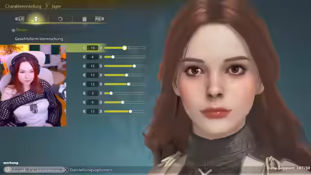 02:07:10Die Streamerin beschäftigt sich intensiv mit der Charaktererstellung im Spiel. Sie passt Details wie Haarfarbe, Augenbrauen und Zähne an. Es gibt Schwierigkeiten mit der Farbakzentuierung der Haare, da die gewünschten Strähnchen nicht realisierbar sind. Die Streamerin probiert verschiedene Frisuren aus, darunter eine, die ihr besonders ähnlich sieht und eine Aloy-Frisur. Sie stellt fest, dass viele Frisuren nur Ombre-Farbverläufe bieten. Es folgt die Anpassung von Körperhaltung und Kleidung, wobei die Streamerin amüsiert feststellt, dass die Brüste im Spiel physikalisch korrekt dargestellt werden. Sie entscheidet sich für grüne Kleidung, da ihr diese Farbe gut steht. Zum Schluss wählt sie zwischen verschiedenen Rüstungsoptionen, wobei sie zwischen einem ritterlichen Aussehen und einer freizügigeren Variante schwankt. Die Möglichkeit, Rüstungsteile zu mischen, begeistert sie. Sie stellt fest, dass selbst Kettenhemden die Brüste realistisch darstellen. Nach etwa einer Stunde ist die Charaktererstellung abgeschlossen, und die Streamerin ist zufrieden mit dem Ergebnis.