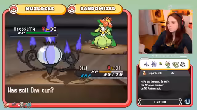 02:30:17Ein wildes Ossichonk erscheint, und die Spielerin kann nicht fliehen. Kurz darauf kommt es zu einem Trainer-Kampf gegen ein Dressella, das sich als äußerst schwierig erweist. Dressella bufft seine Werte extrem, was den Kampf zu einer großen Herausforderung macht. Silicious mit seiner Feuerattacke und Arnie mit Zauberblatt werden eingesetzt, doch Dressella heilt sich immer wieder vollständig. Die Spielerin muss strategisch vorgehen, um Arnie am Leben zu halten und gleichzeitig Schaden zu verursachen. Divi wird eingesetzt, um Dressella mit Giftpuder zu vergiften, was sich als entscheidend für den Kampf erweist. Trotz der Verwirrung von Arnie und der ständigen Heilung des Gegners gelingt es dem Team, Dressella zu besiegen. Die Spielerin bezeichnet diesen Kampf als einen der härtesten in dieser Nuzlocke, vergleichbar mit früheren Begegnungen mit Reshiram und Ditto. Die Bedeutung von Gift als Strategie wird hervorgehoben. Nach dem Kampf trifft die Spielerin auf weitere Trainer und Pokémon, während sie versucht, ihren Weg durch die Höhle zu finden.
