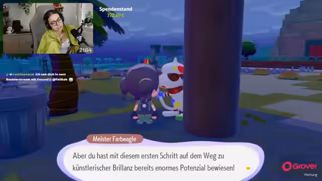 00:29:43Nach den persönlichen Gesprächen kehrt der Streamer zu Pokémon Pocopia zurück. Er beschreibt, wie er das Spiel weiter vorantreibt und nachdem er ein Pokémon Center errichtet hat, erzählt ihm der Spielcharakter von weiteren, noch unerforschten Regionen, in denen einst Menschen gelebt haben. Dies deutet auf die Fortsetzung der Hauptstory hin. Die Suche nach den passenden Pokémon, um eine bestimmte Aufgabe zu erfüllen, gestaltet sich dabei jedoch schwierig.