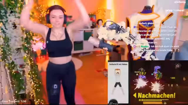 01:52:35Es wird sich gefragt, ob die Zuschauer Sadisten sind oder selbst Sport machen. Es wird erwähnt, dass man auch selbst Sport nebenbei machen kann. Es wird die Switch gestartet und gehofft, dass es kein Wackelkontakt gibt. Es wird die Musik leiser gestellt. Es wird eine Wasserflasche geholt. Es wird erwähnt, dass heute der 22. Tag des Abenteuers ist. Es wird ein Tanzstudio als Aufwärmtraining ausgewählt. Es wird nachgefragt, welche Sportarten die Zuschauer betreiben. Es werden verschiedene Sportarten wie Volleyball, Kraftsport und Gymtraining genannt. Es wird das Oberteil ausgezogen und das Cheersquad begrüßt. Es wird Seitenschritt mit Heben gemacht. Es wird sich darüber lustig gemacht, dass eine Übung nicht gezählt hat. Es wird sich gewundert, dass manche Leute fünfmal die Woche ins Gym gehen.